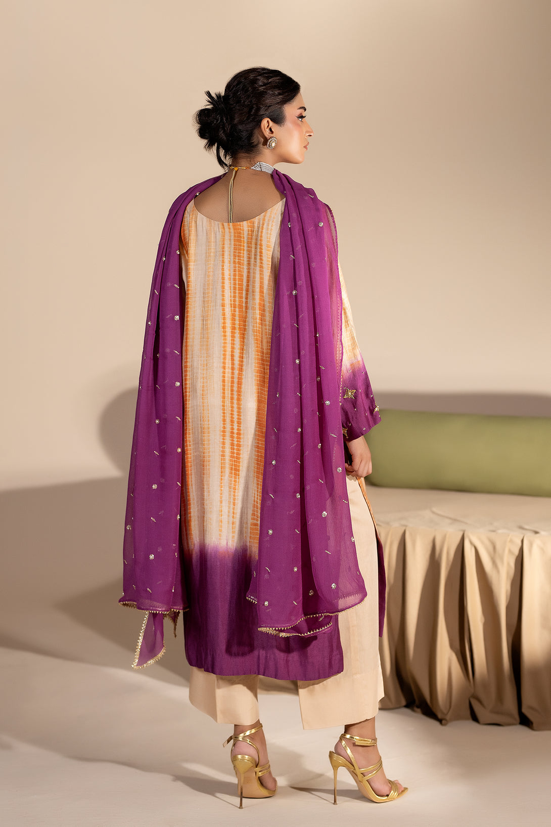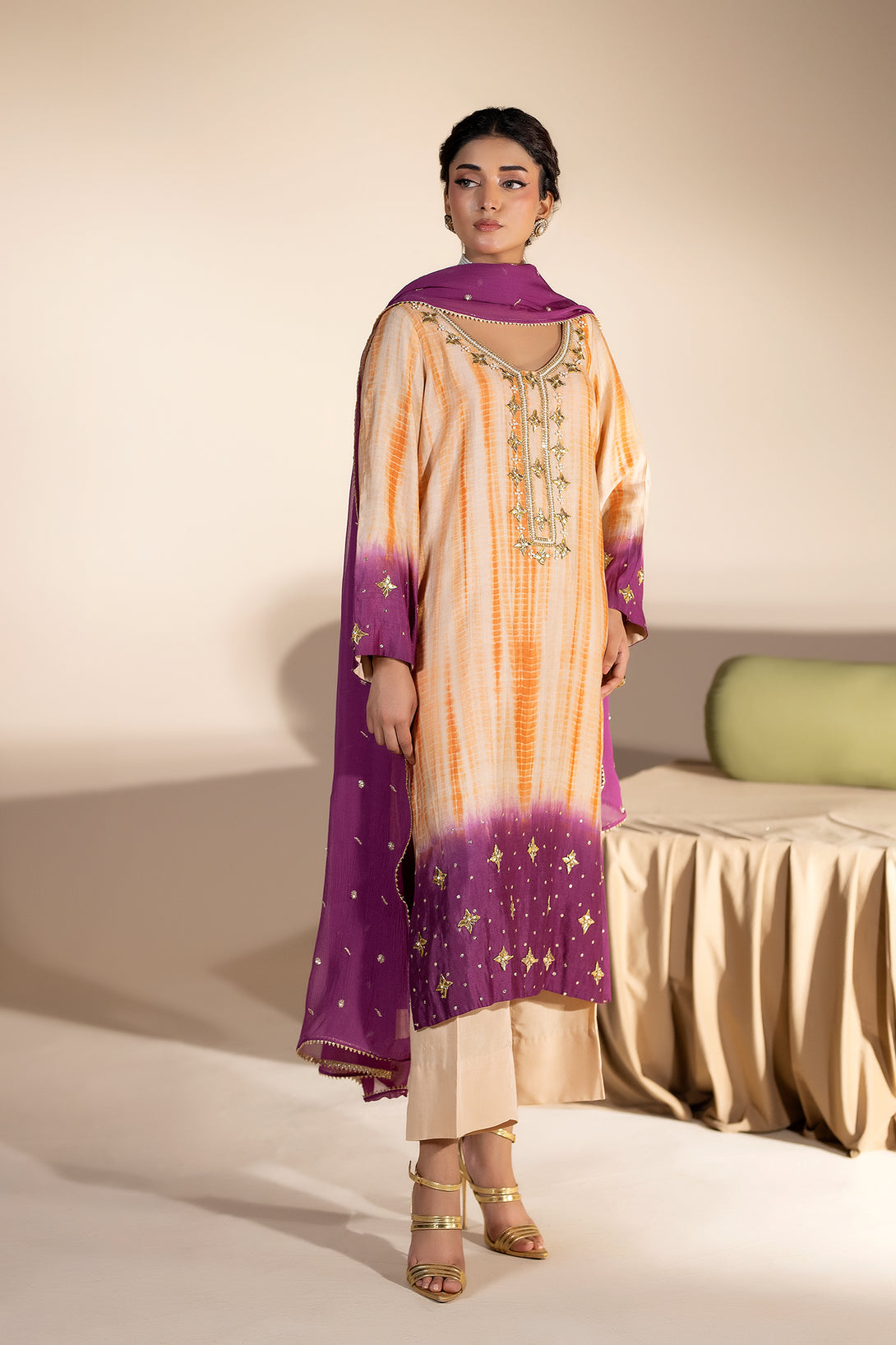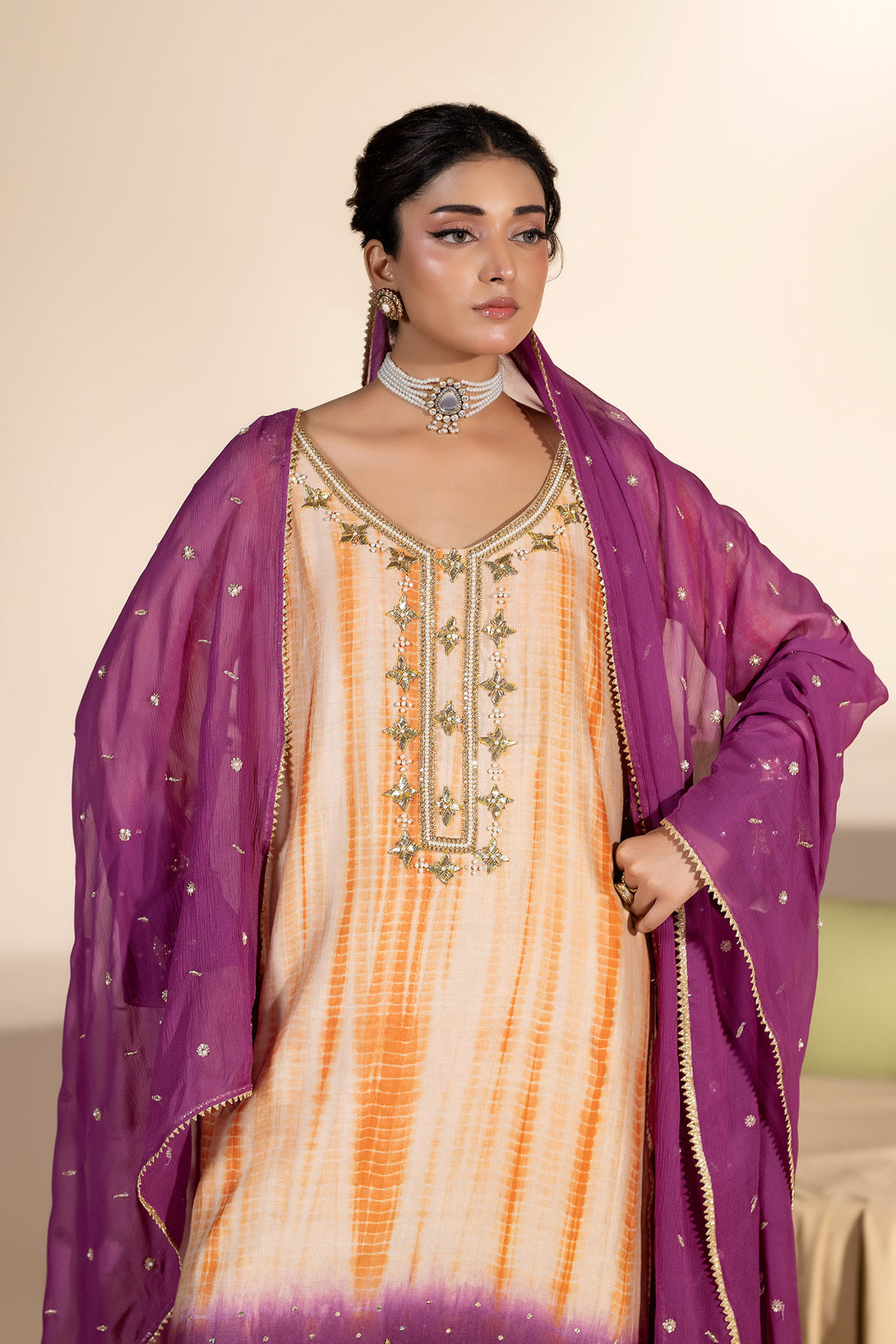 A vibrant celebration of color and craft, Musarat blends soft peach, orange, and purple hues in a stunning dye-and-dye design. The shirt features intricate gota and dabka work along the neckline, sleeves, and borders — creating a refined balance of traditional artistry and contemporary charm.