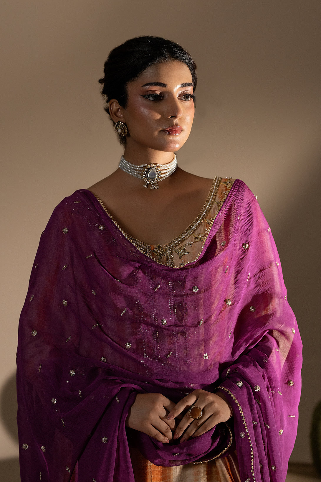 Paired with light peach straight trousers for a clean, elegant silhouette, the look is completed with a rich purple dupatta adorned with sitara detailing and lace finishing, adding a subtle festive sparkle. This ensemble radiates effortless grace — perfect for festive gatherings or formal celebrations.
