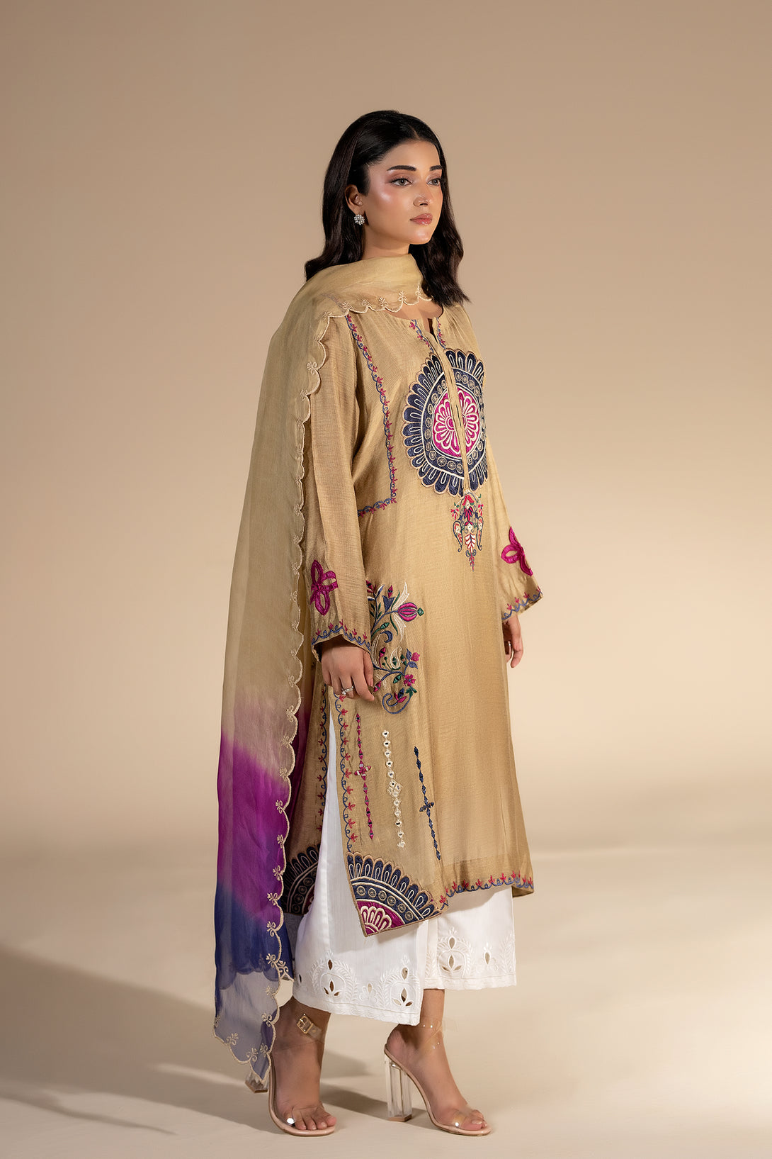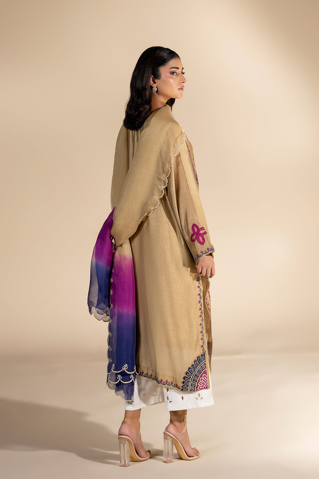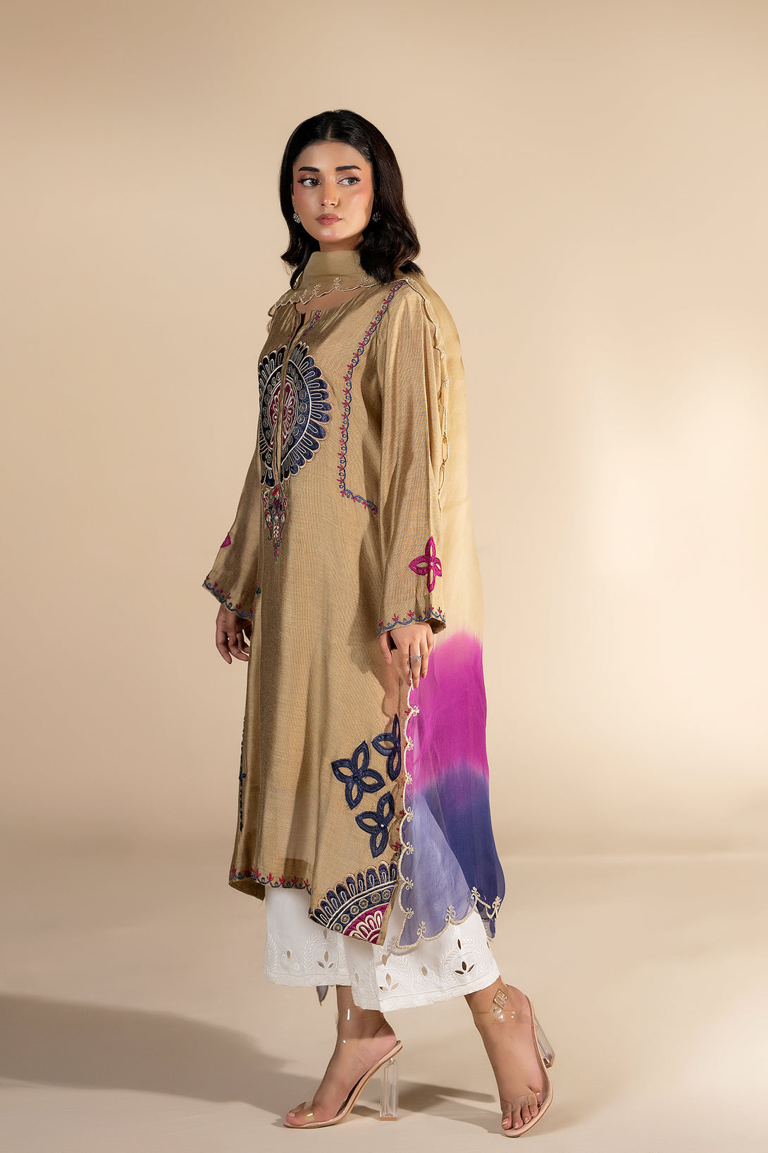 Afsheen is a long gold cotton net shirt adorned with intricate embroidery on the front, paired with elegant embroidered azaar trousers in silk. The look is elevated with a pure organza tie-dye scalloped dupatta, blending hues of blue, magenta, and gold in a mesmerizing pattern that adds movement and charm to the ensemble.