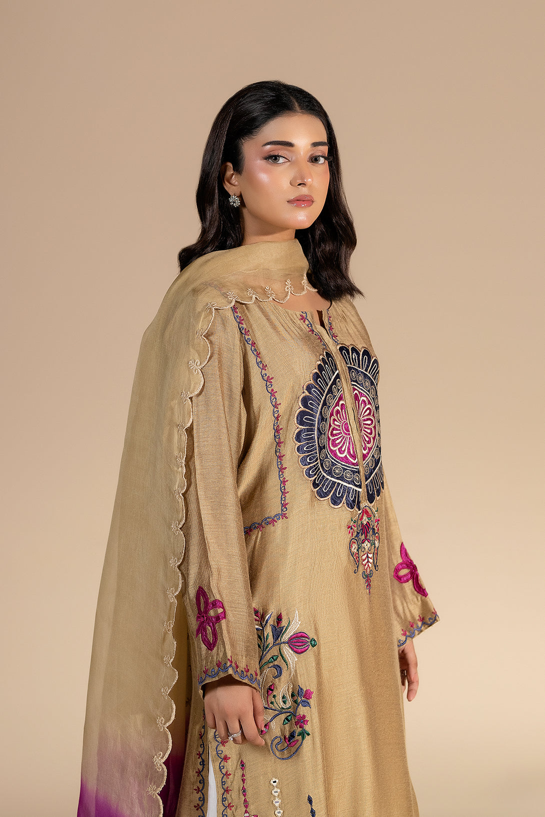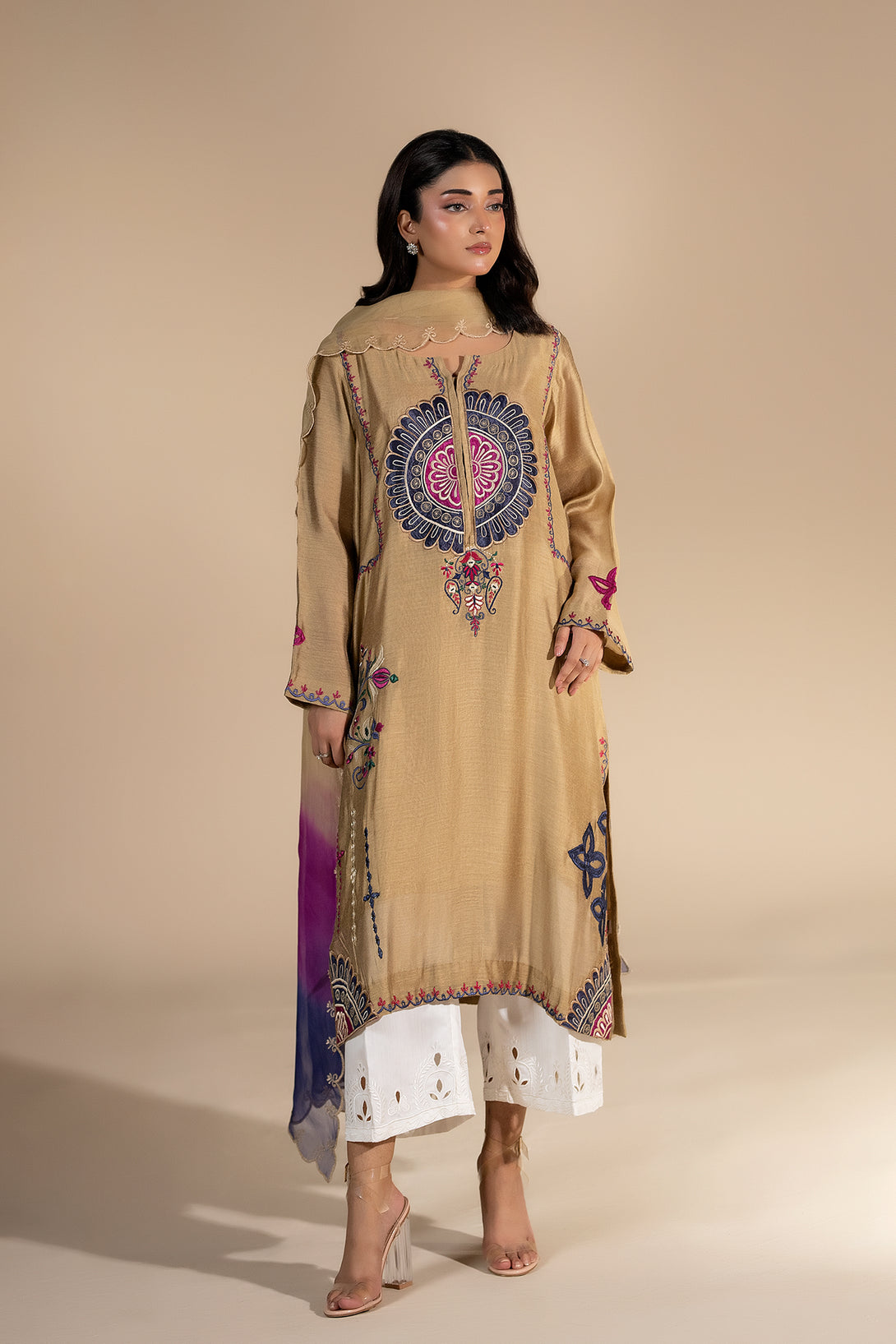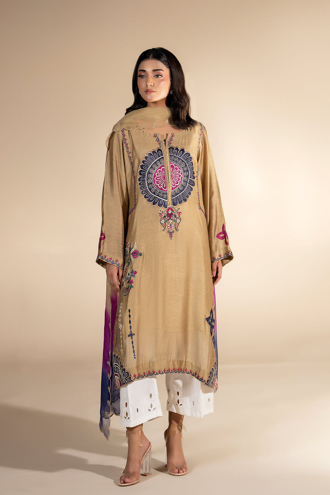 Afsheen is a long gold cotton net shirt adorned with intricate embroidery on the front, paired with elegant embroidered azaar trousers in silk. The look is elevated with a pure organza tie-dye scalloped dupatta, blending hues of blue, magenta, and gold in a mesmerizing pattern that adds movement and charm to the ensemble.