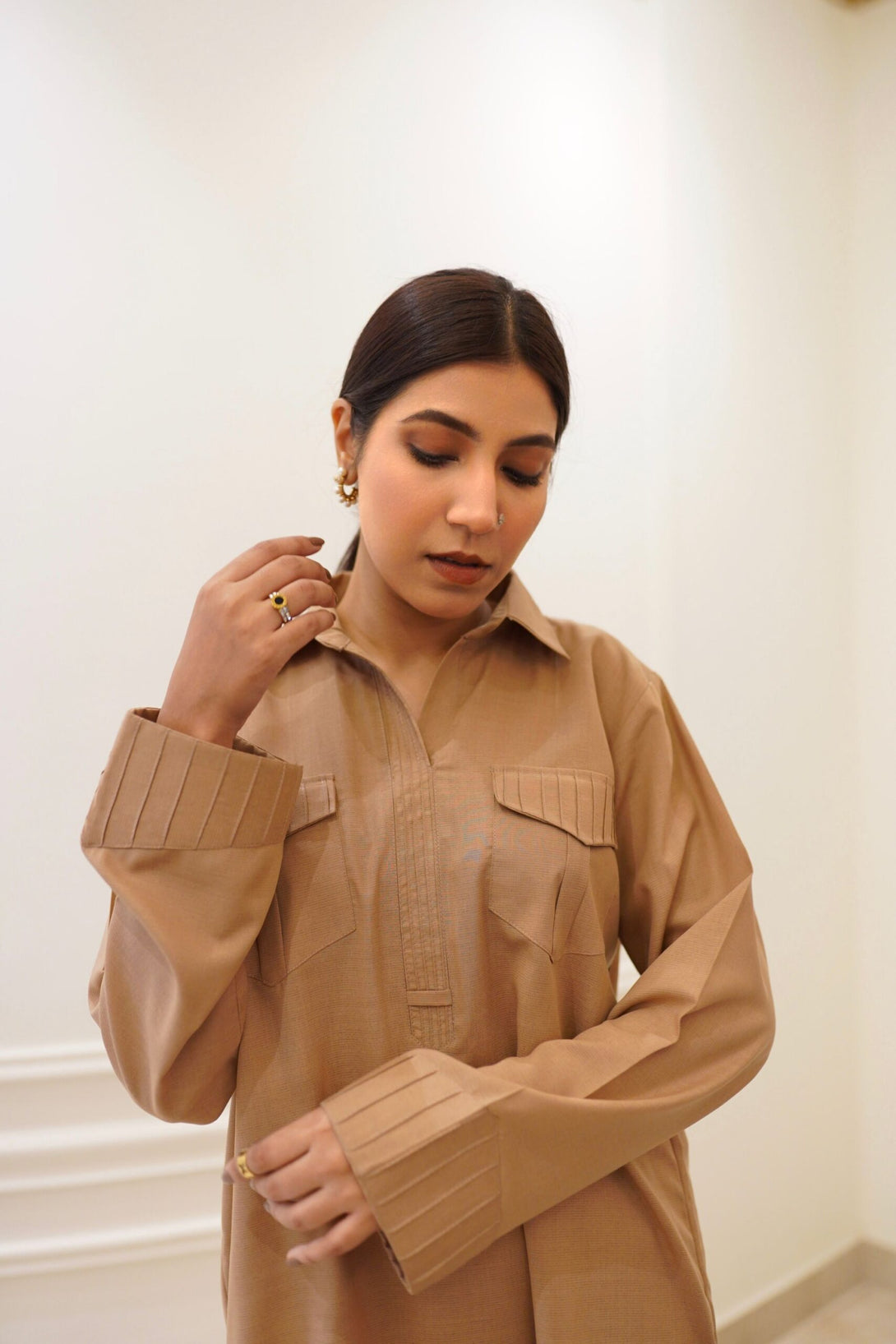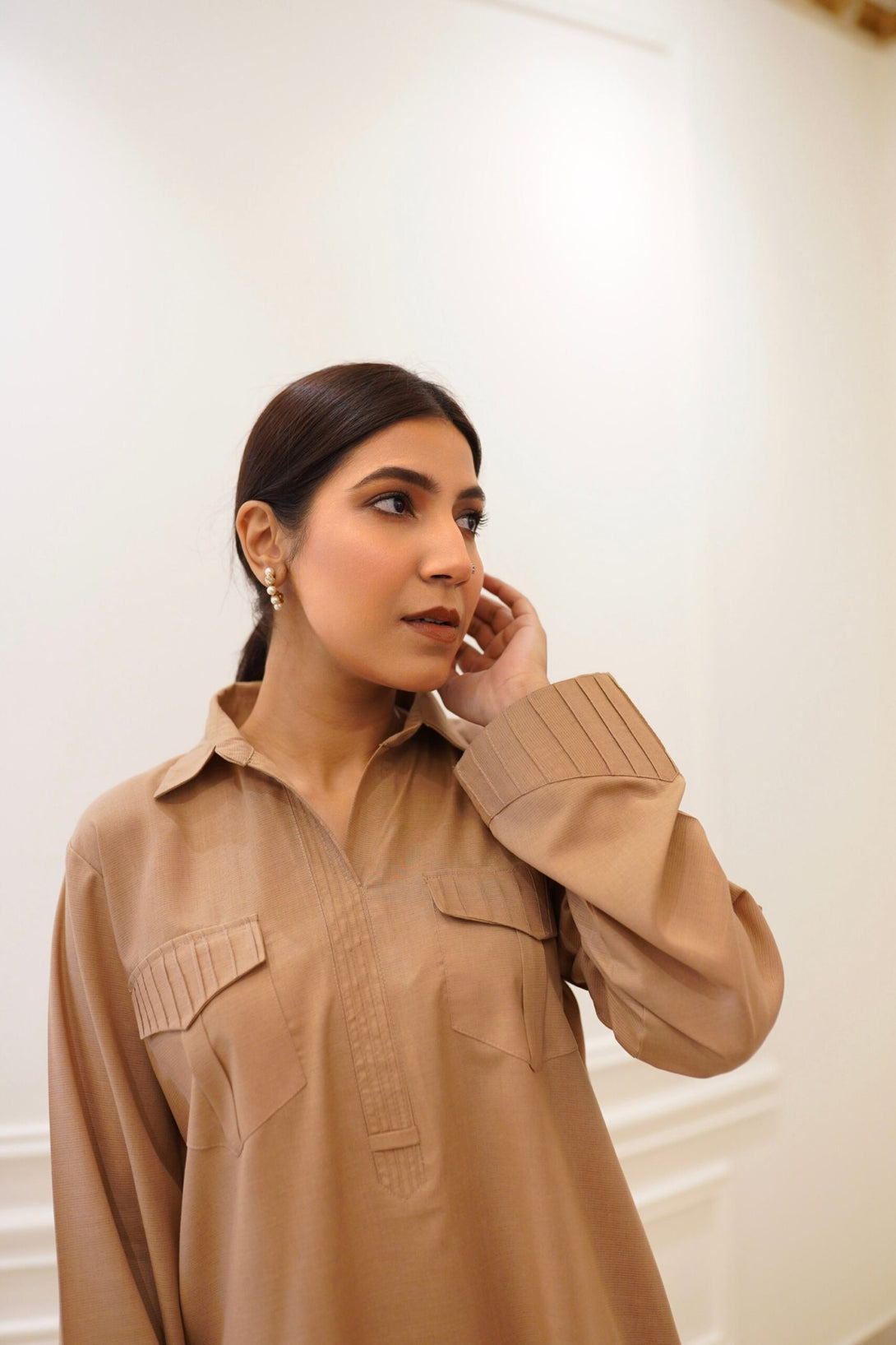 Our nude beige co-ord set epitomizes comfort and style with its pleated back, pleated sleeve ends, and thoughtful design for extra ease. Featuring a collared neckline, front button fastening, and two pockets, this set is paired perfectly with sleek straight pants, seamlessly blending elegance and comfort. Crafted from ultra-soft, wash-and-wear fabric, it offers both sophistication and practicality.