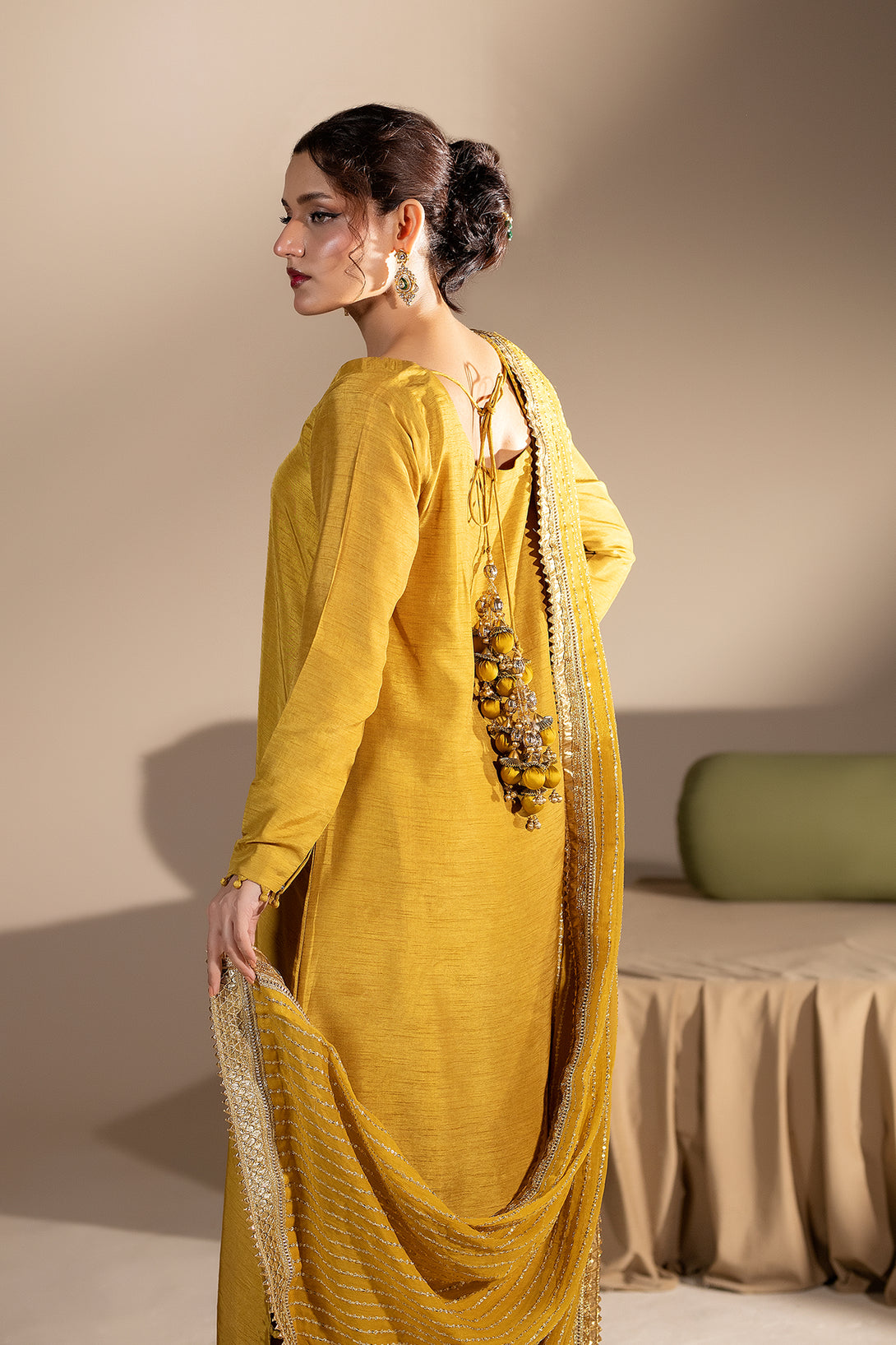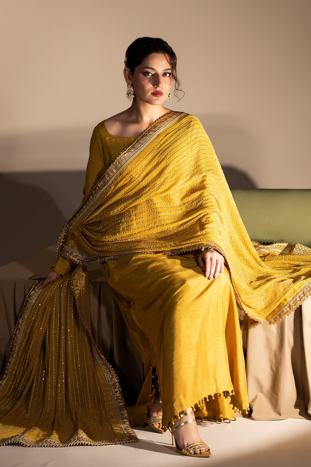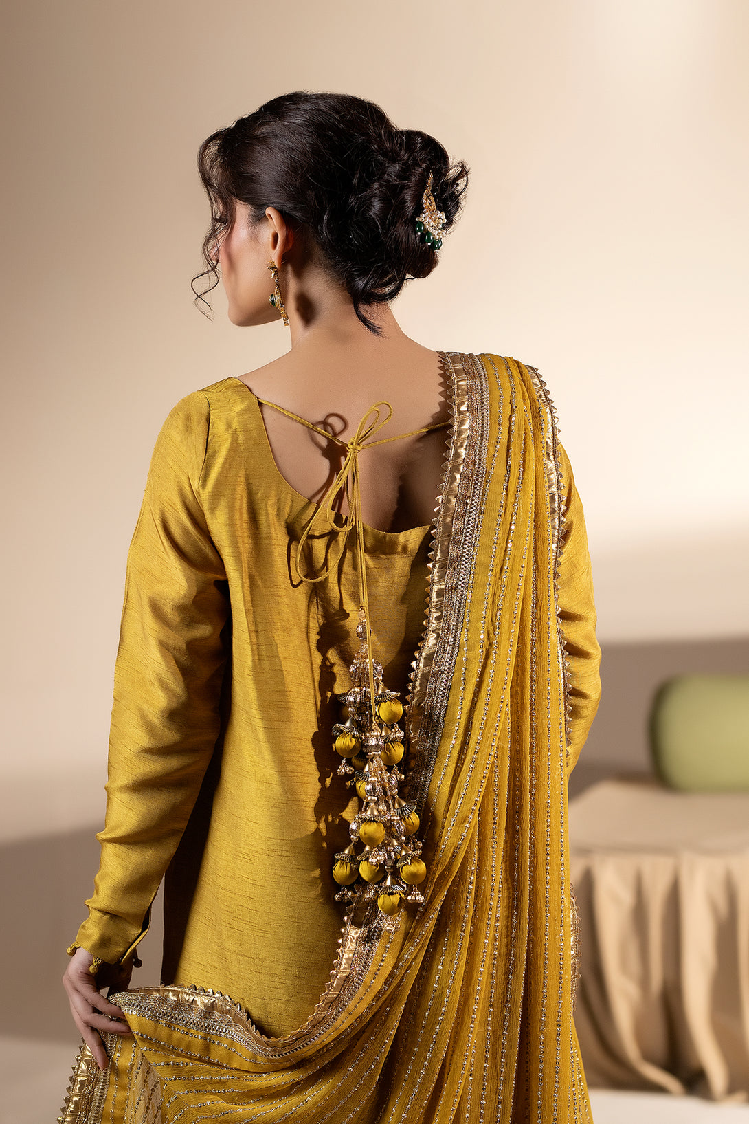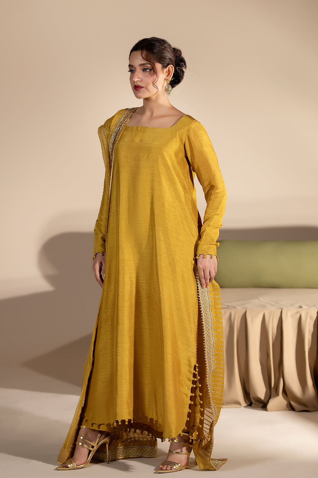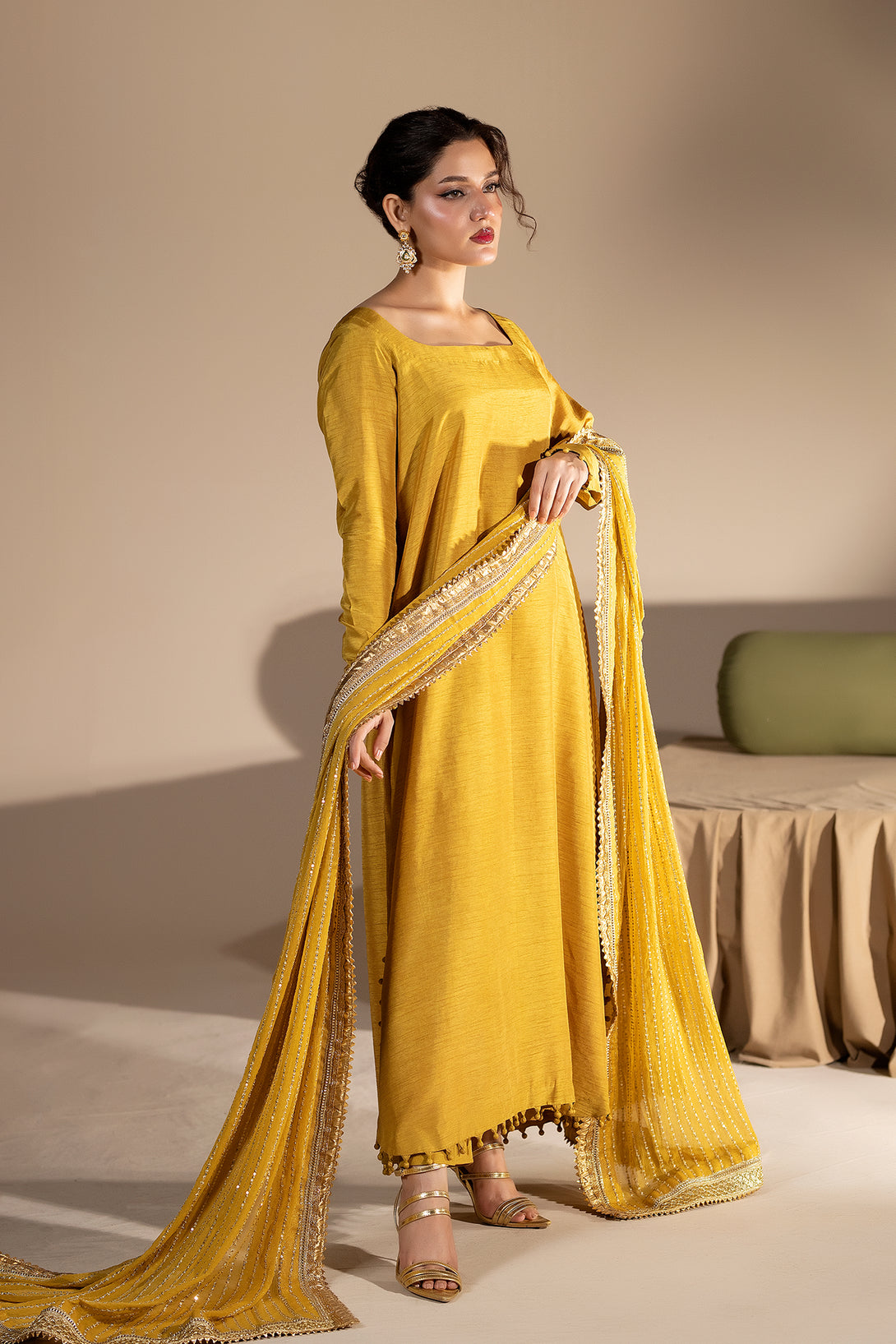 A perfect blend of tradition and modern design, Mehnaz comes in a stunning mustard hue that radiates warmth and elegance. The long shirt features a minimalist plain base elevated with handcrafted fabric tassels on the sleeves, borders, and neckline — adding a playful yet refined charm. The back of the shirt is adorned with delicate tassels, enhancing its graceful silhouette.