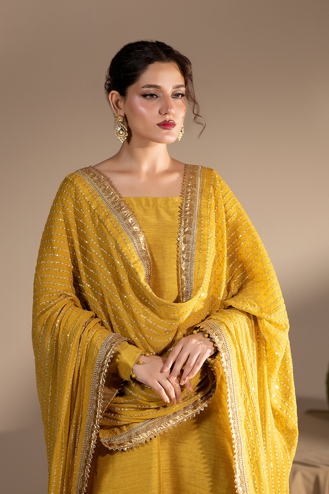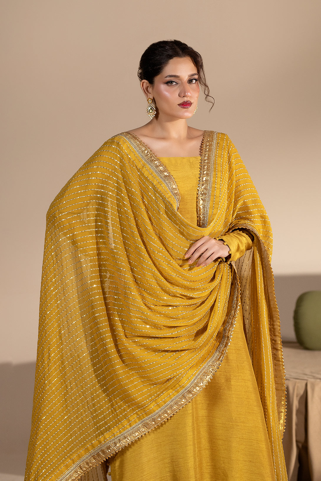 The outfit will be delivered within 10-14 days within Pakistan and 2-3 weeks for international deliveries. Urgent orders can be placed via WhatsApp.