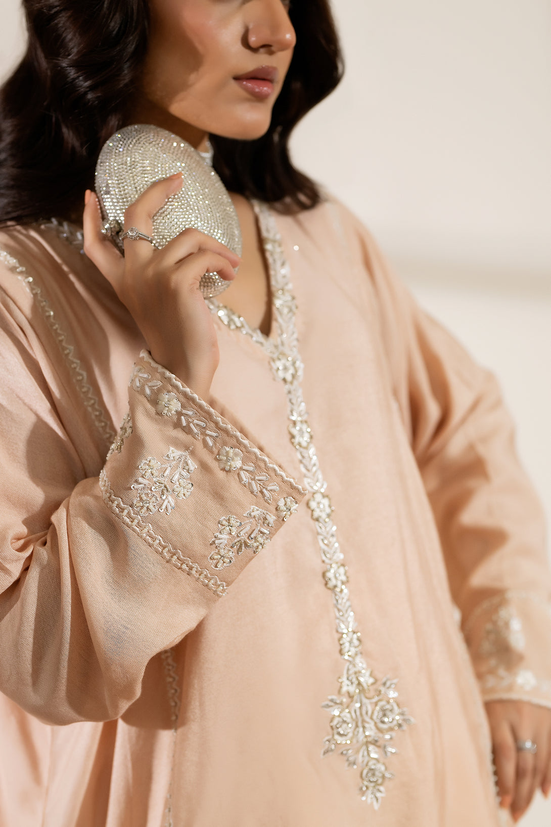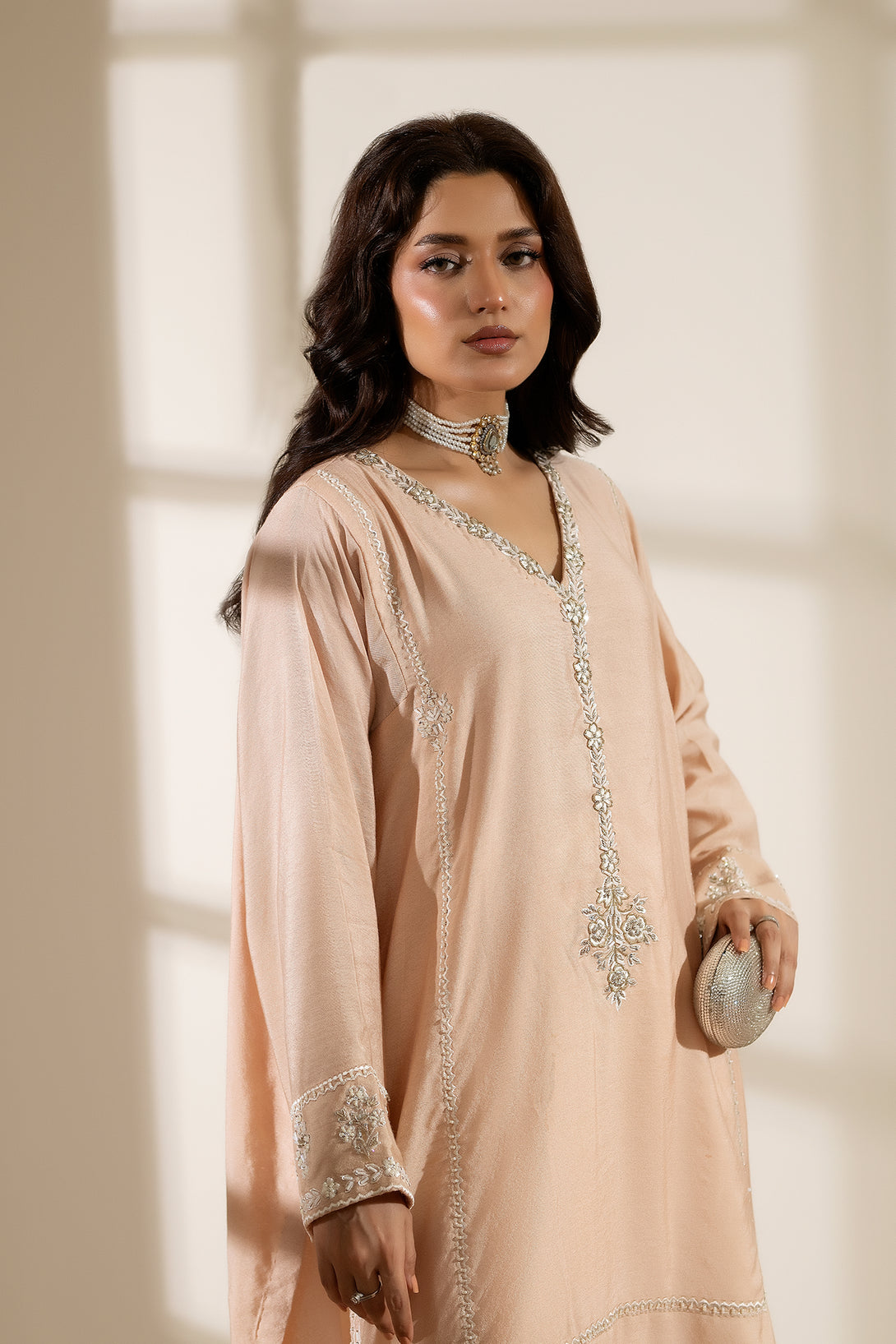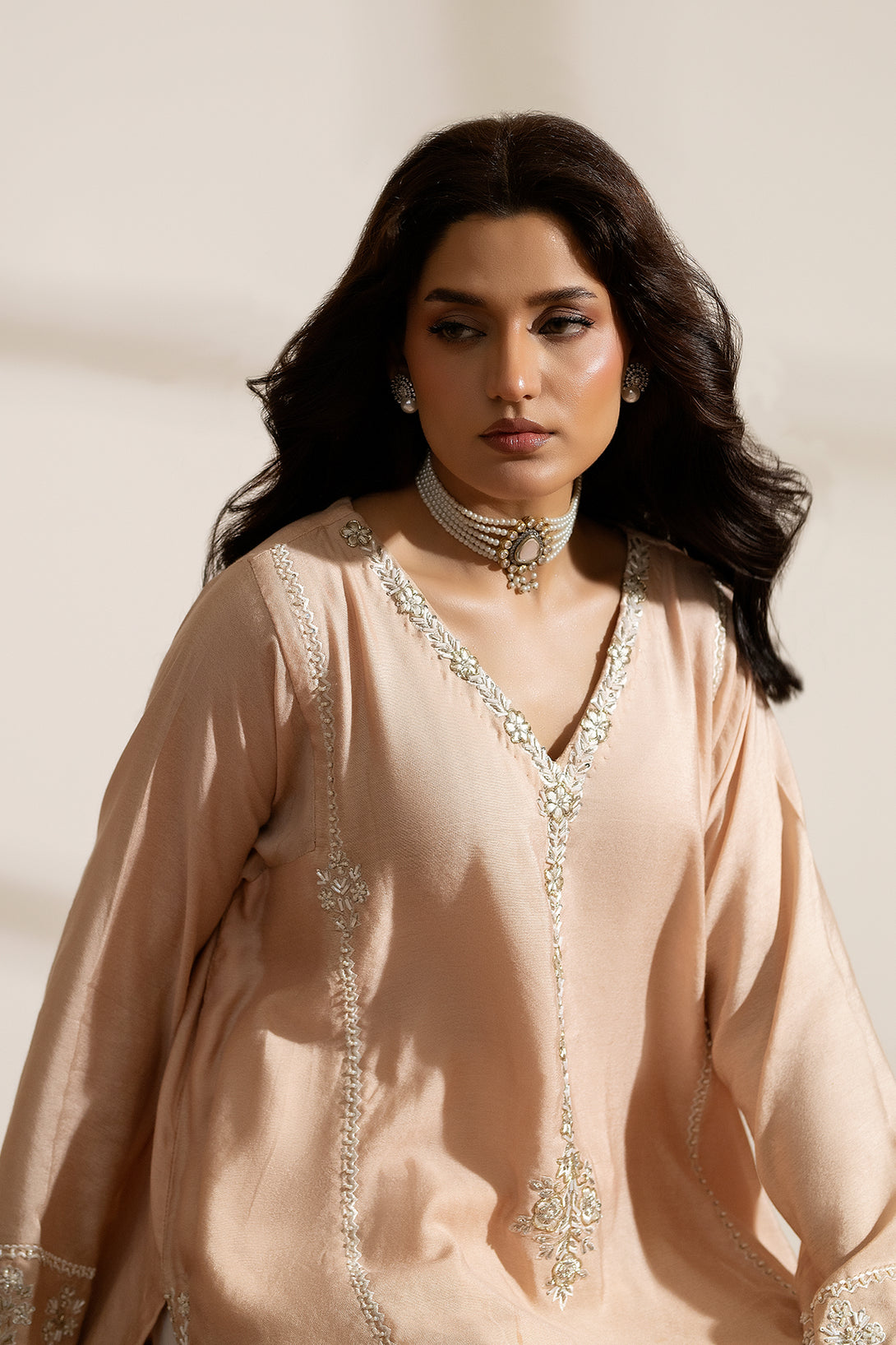 Rosane is a peach two-piece ensemble that embodies understated elegance. The shirt features delicate embroidery and dabka work on the front and sleeves, adding just the right touch of festive charm without overwhelming the design.