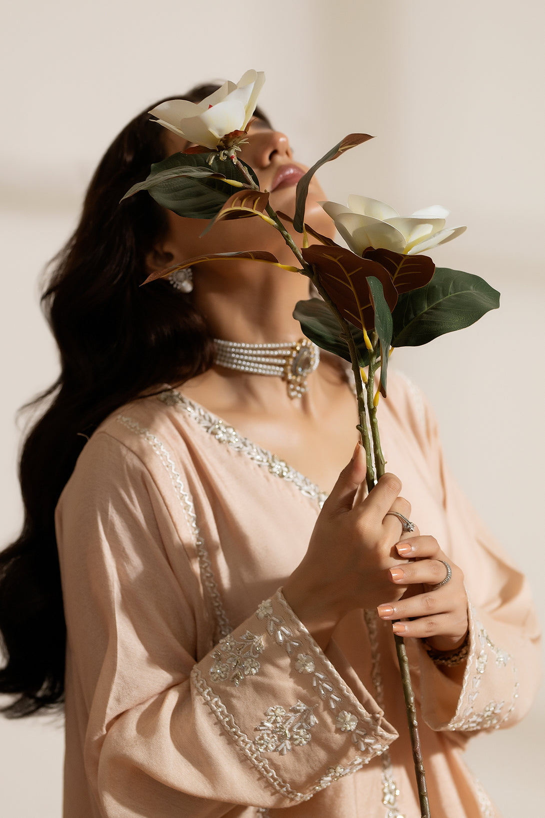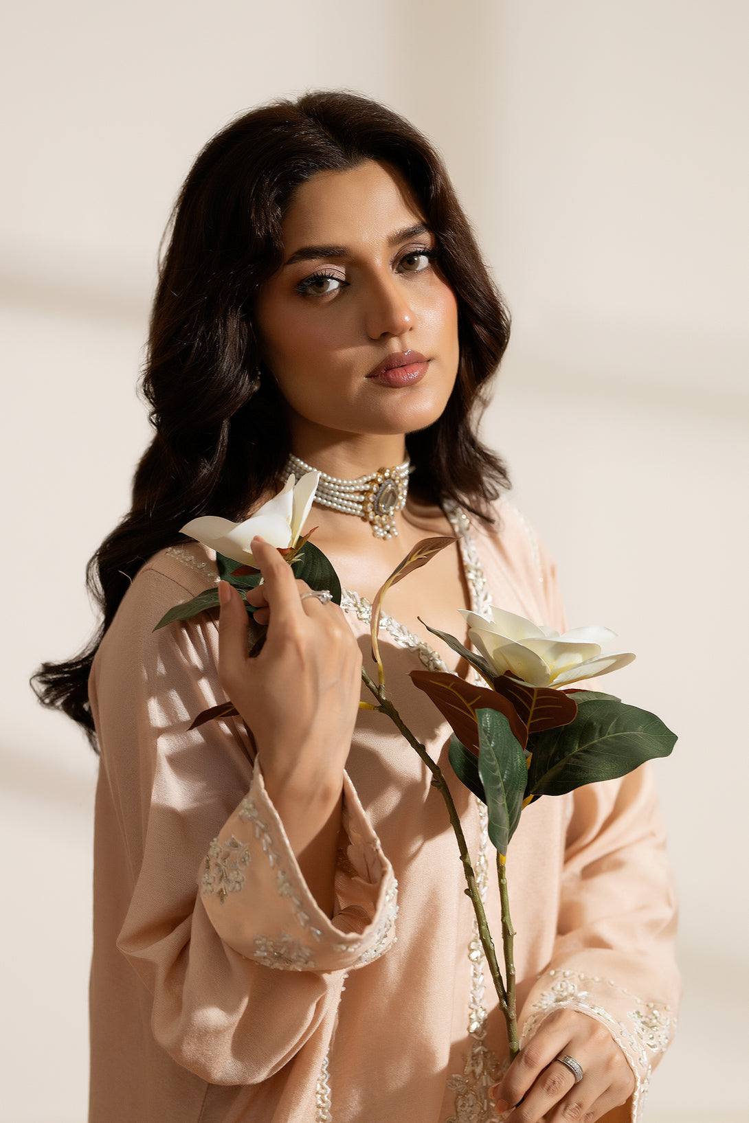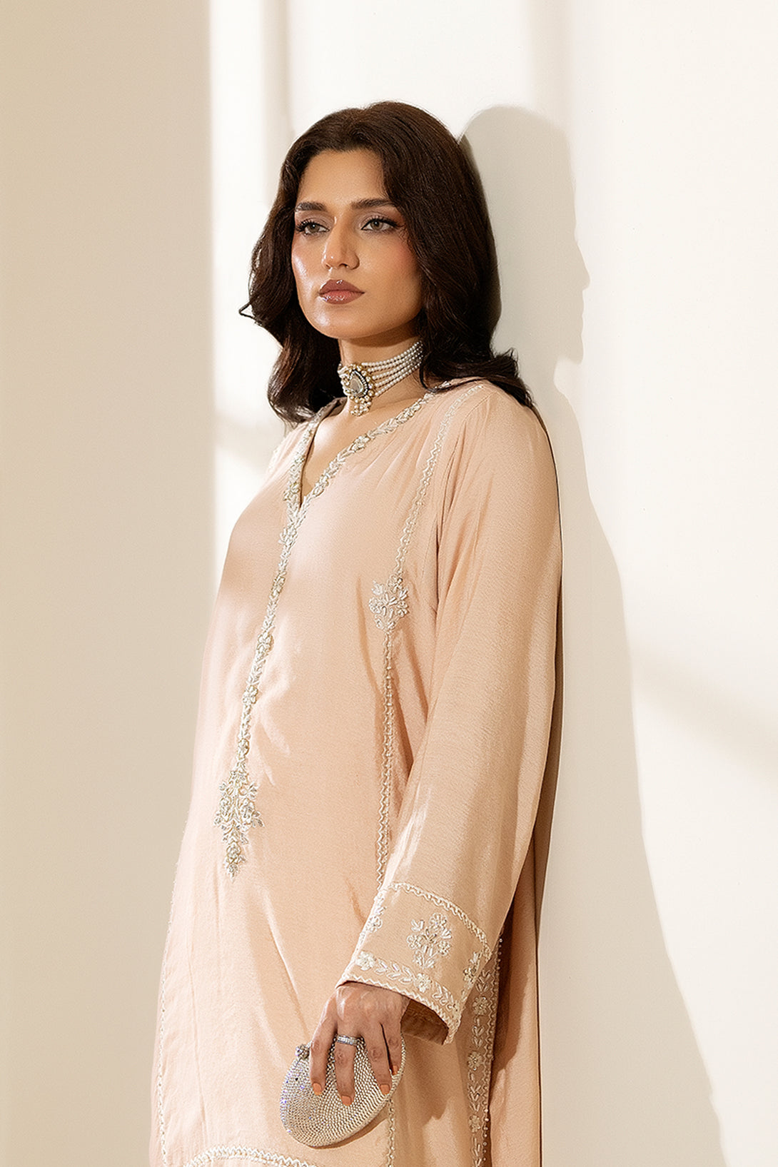 Rosane is a peach two-piece ensemble that embodies understated elegance. The shirt features delicate embroidery and dabka work on the front and sleeves, adding just the right touch of festive charm without overwhelming the design.