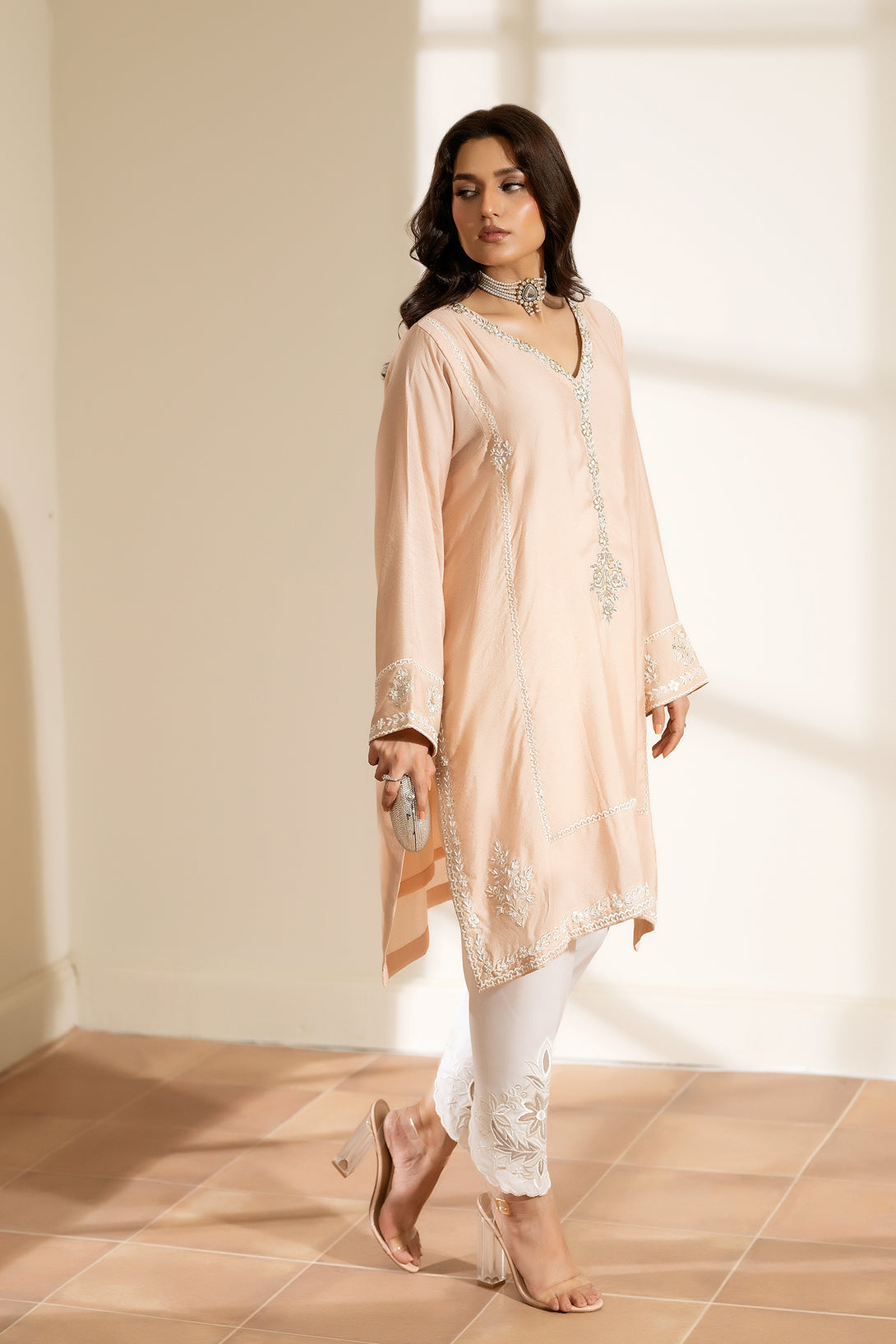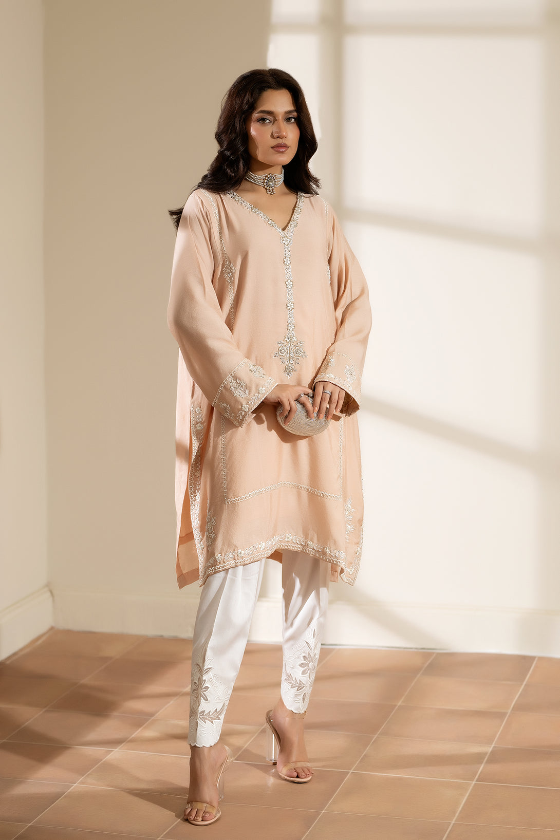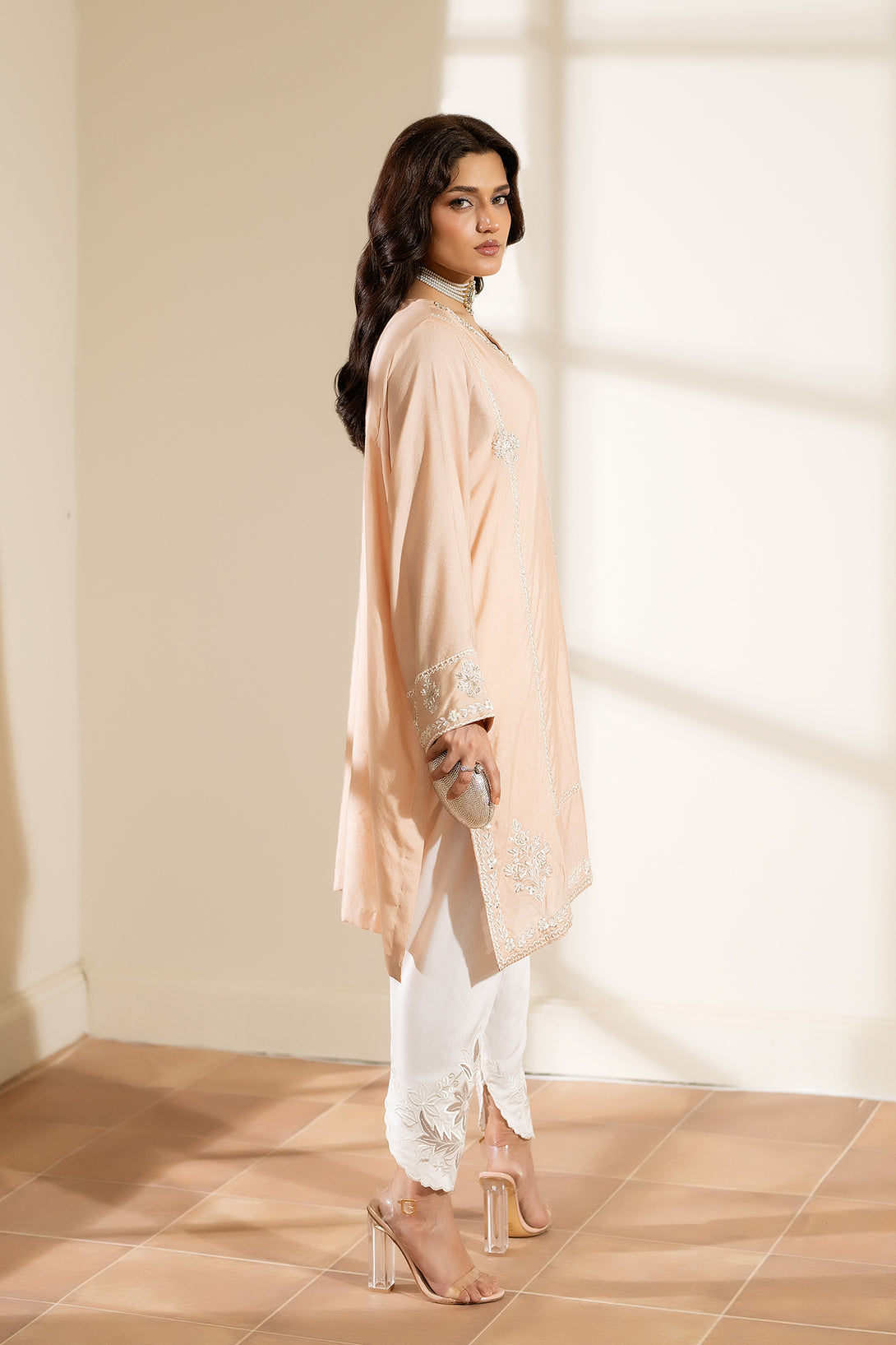 It is paired with a fitted embroidered shalwar, completing the look with subtle sophistication. Perfect for intimate gatherings or semi-formal occasions, this outfit captures the beauty of simplicity elevated by fine craftsmanship.